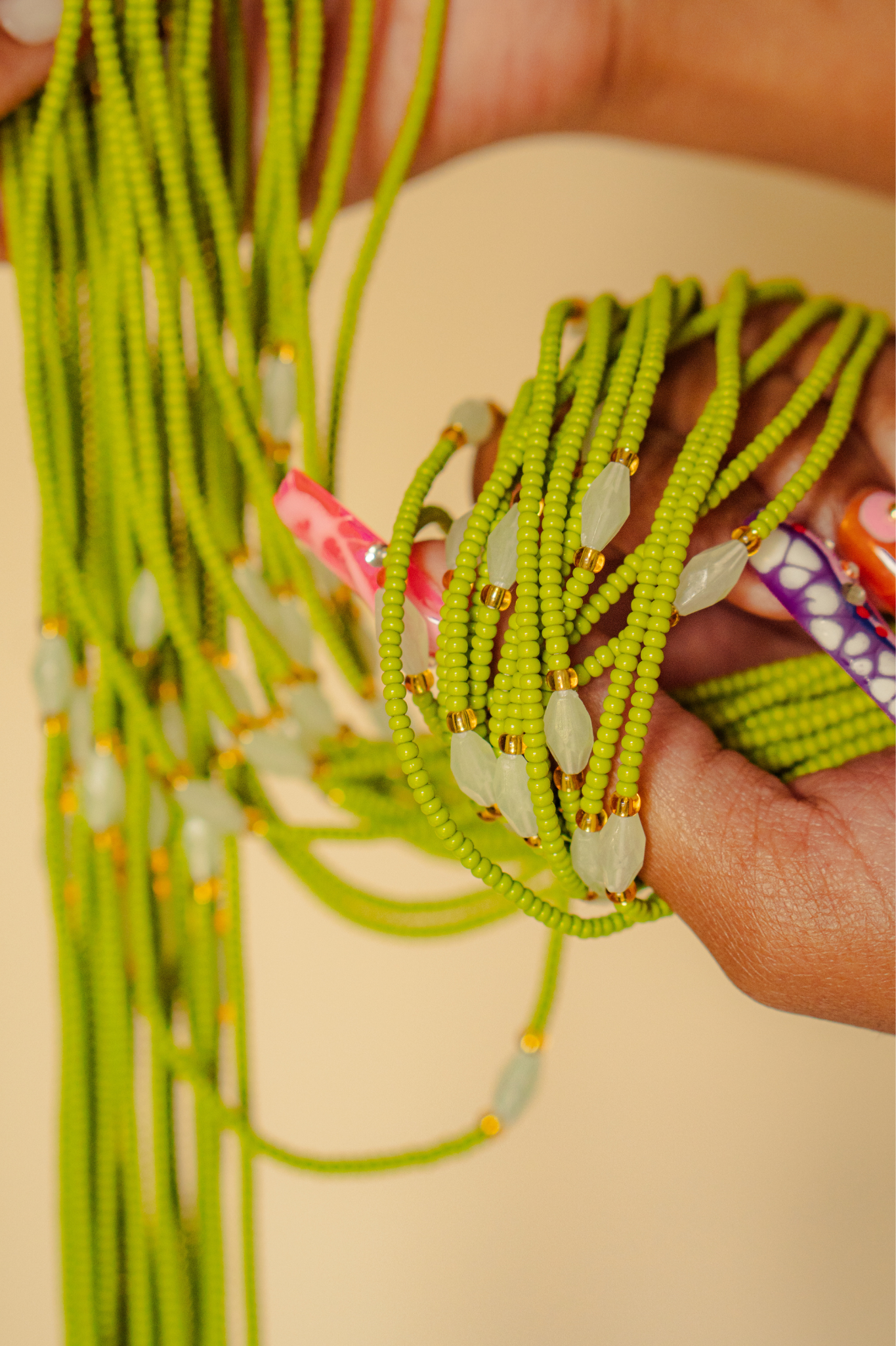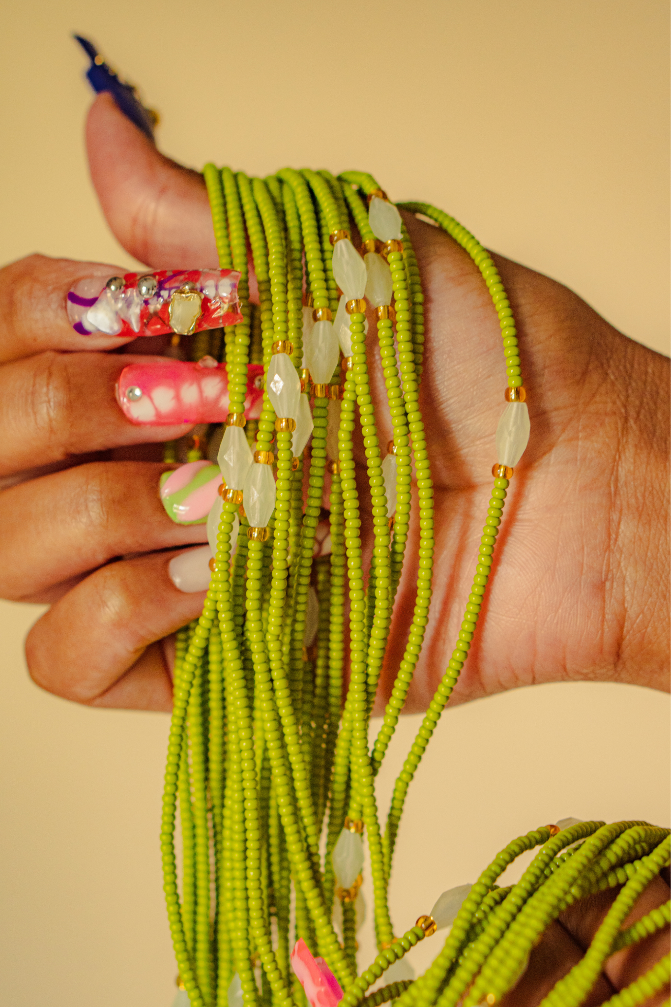 All of our waist beads are strung with 6-8 strands of uncoated cotton thread for durability and longevity.
